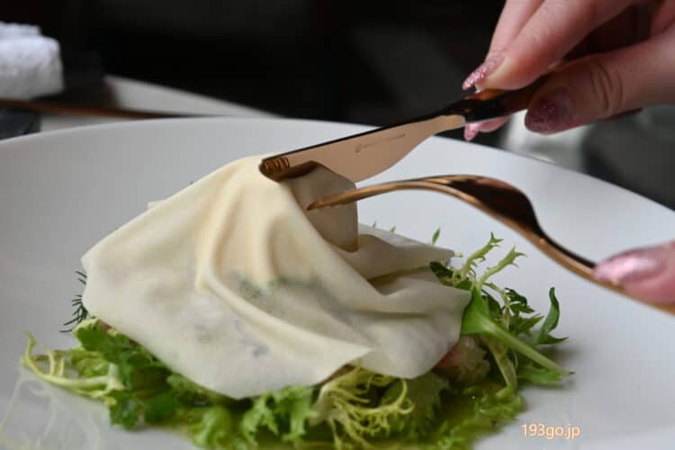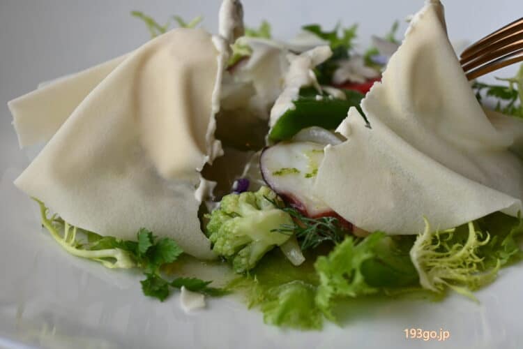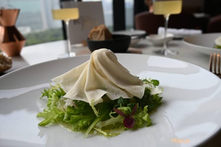 ベールに包まれたグリーン野菜とシーフードのマリネ