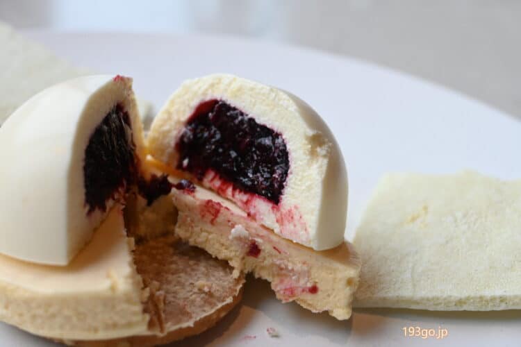 ローズマリー香る純白のメレンゲ。中のスイーツはドーム型で白胡麻のパルフェや、 ヨーグルトとローズマリーのムース、 毒々とした色味のカシスマーマレードなど意外な味の組み合わせが堪能できる一皿。
