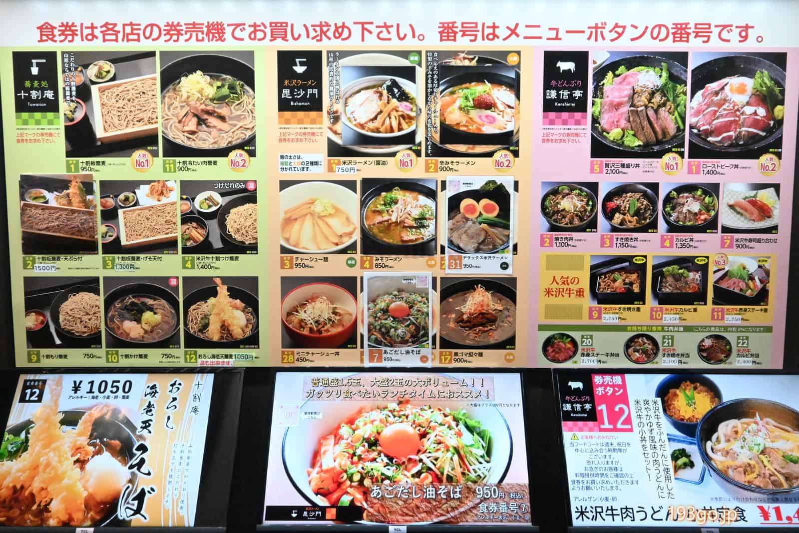 食事は、米沢牛ステーキレストラン「牛毘亭」をはじめ、フードコートには米沢ラーメン、そば、牛丼などの専門店が揃う。
