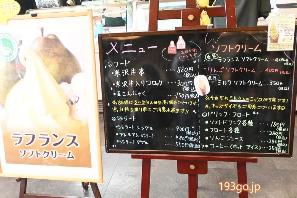 ファストフードではソフトクリーム、ジェラート、米沢牛串・コロッケなどが販売。