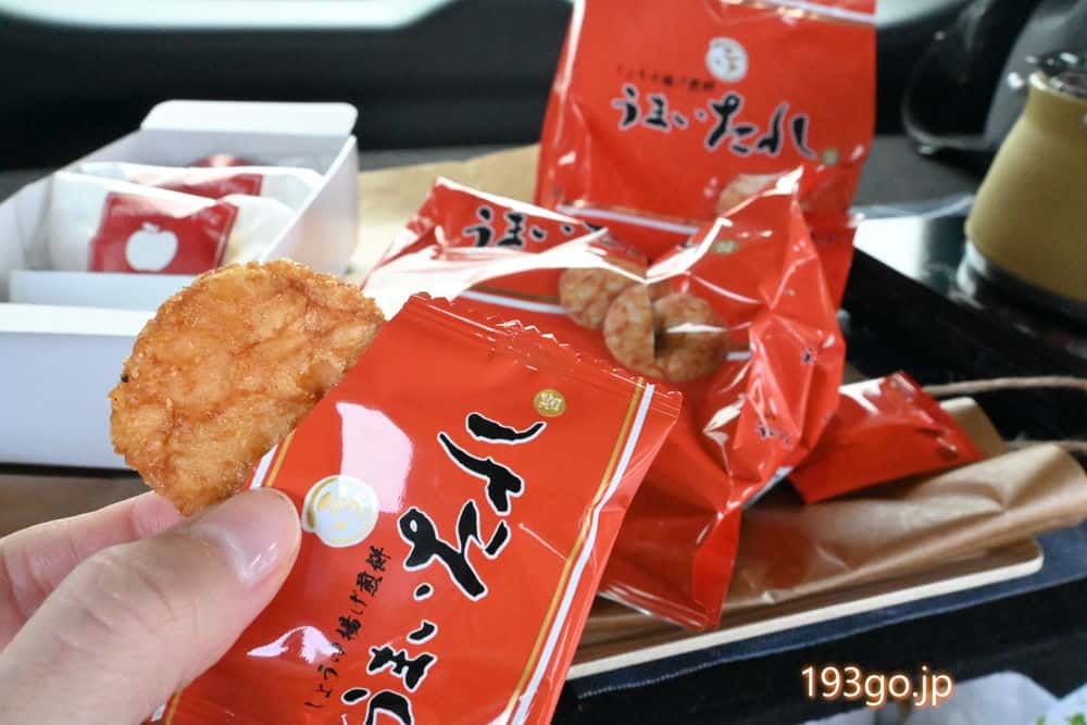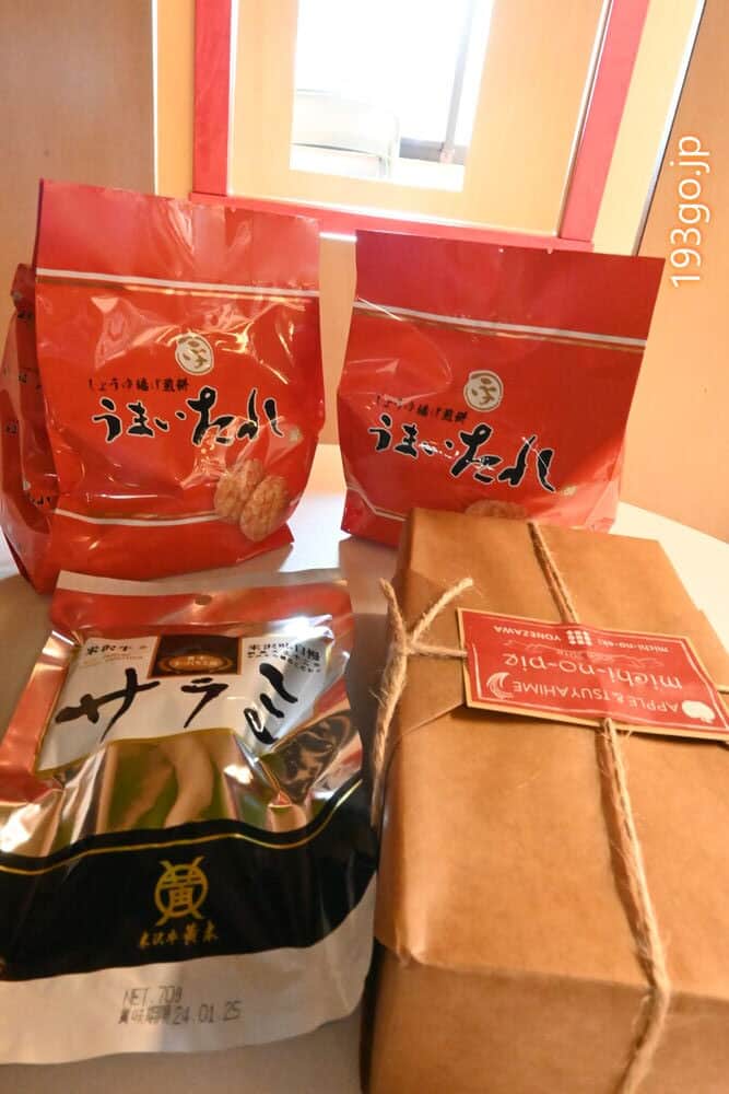 お土産は、人気№1のりんごパイと、うまいたれのしょうゆ揚げせんべい、サラミも。