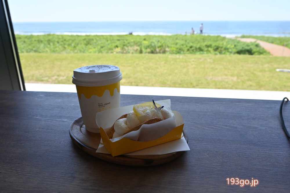 人気のチーズスイーツもテイクアウト。フワフワの生地に濃厚でフレッシュなチーズクリームがたっぷりサンド。レモンをかじり海を見ながら爽やかな気分!