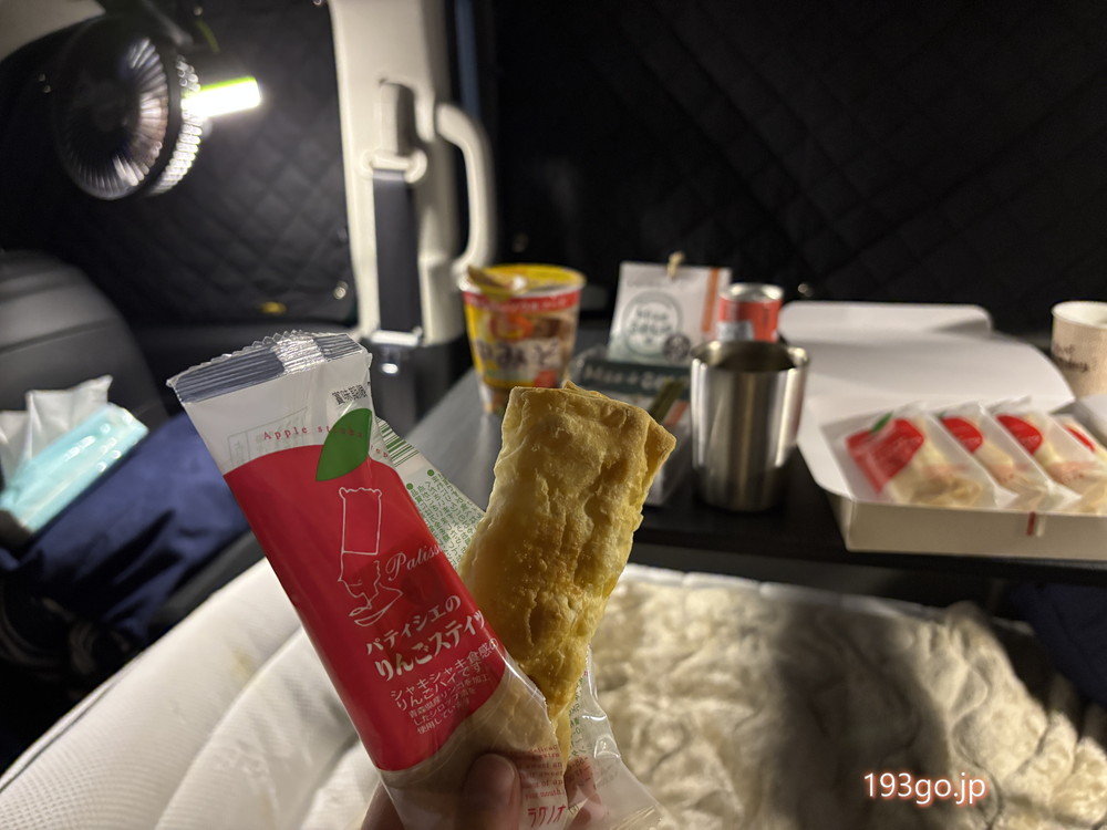 来るときにサービスエリアで調達したグルメを楽しむ。