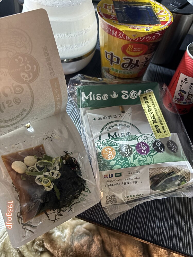 長者原SAでゲットした三陸わかめ屋の味噌スープ… わかめ、めかぶ、ふのり、のり、とろろの5食入り!三陸沖の海藻づくし~。スープやヌードルは車中でお湯を沸かして注ぐだけなので役立つ。
