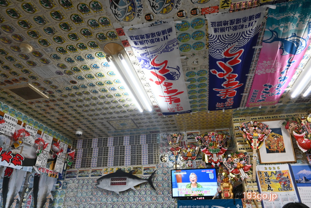 浅虫温泉エリアに戻ってくると、「鶴亀屋食堂」がオープン。開店時には列ができていた。一斉に入店。店内は、天井も壁も、トイレにまでシールや旗がぎっしり。かなり賑やか。