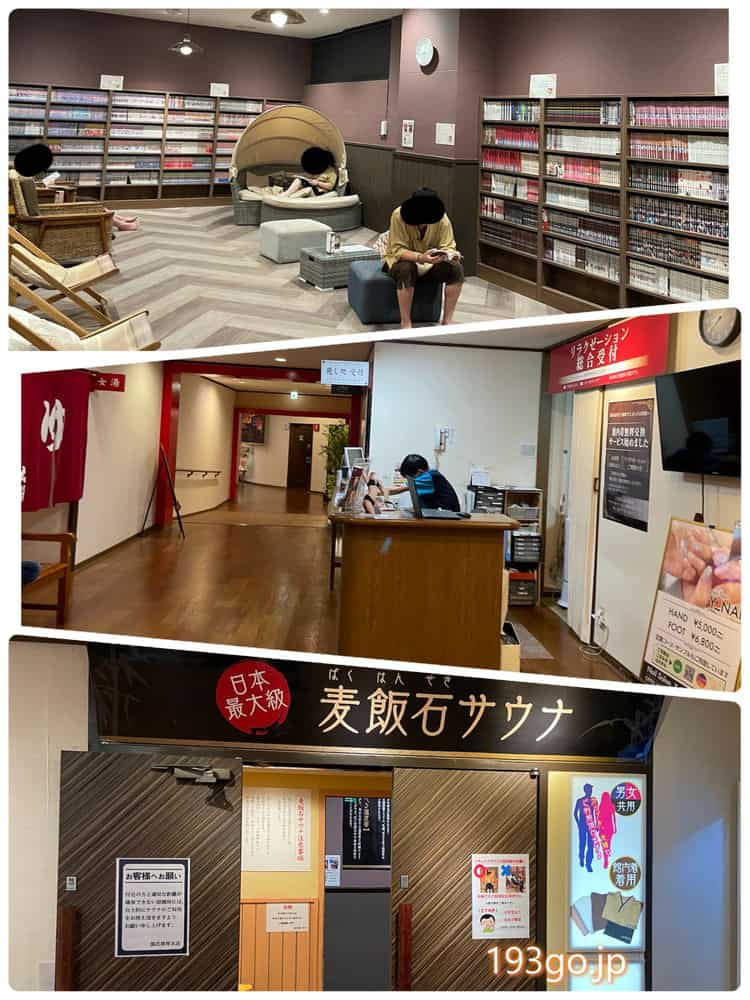 浴室外に男女共用の館内着で入る麦飯石サウナと、クールルーム、リラックスラウンジ。