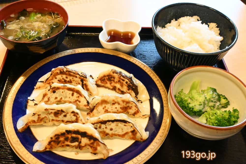 野菜メインの具材のジューシー餃子。お米もツヤツヤで美味しい。