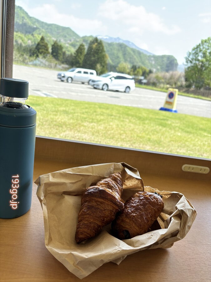 山を眺めながら焼きたてパンを頬張る
