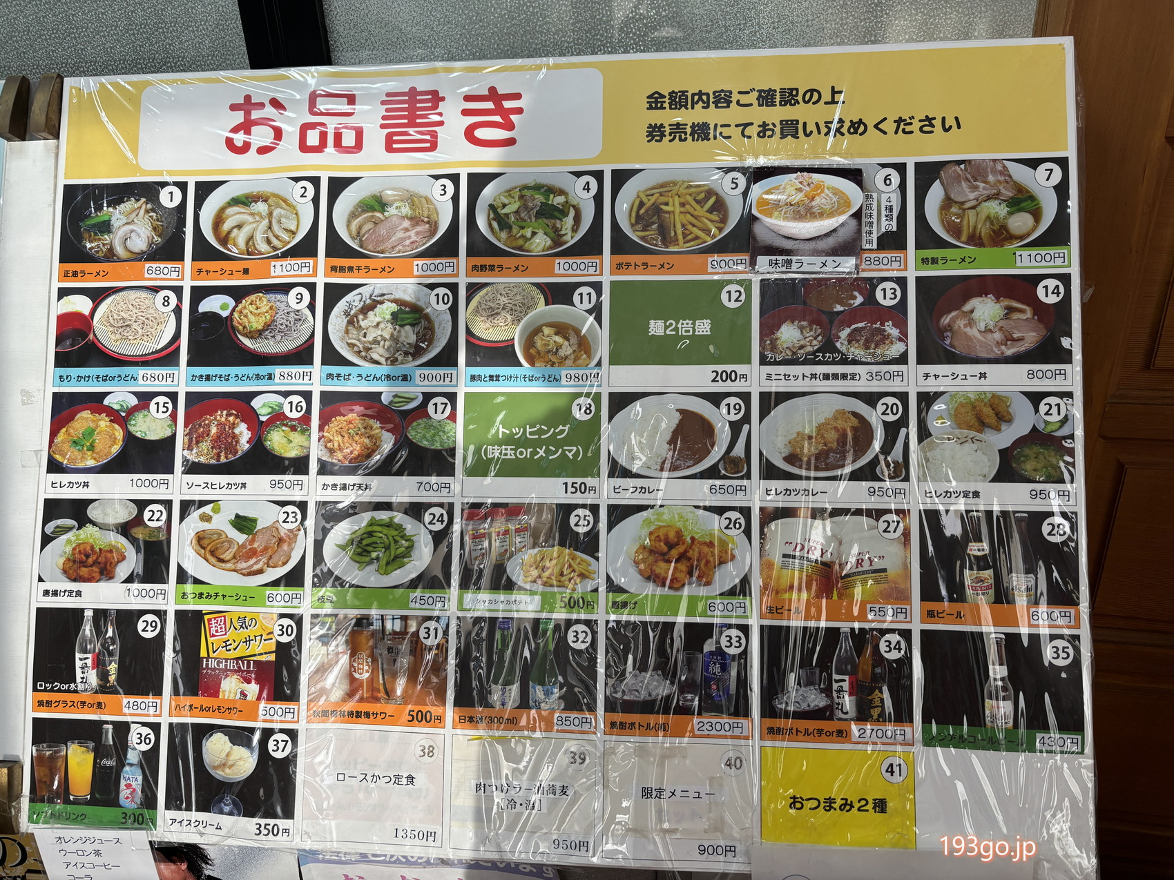 フードメニューは特製ラーメン、特選ロースかつ定食、カツカレー、カレーうどん、アジフライ定食、レバニラ定食など。