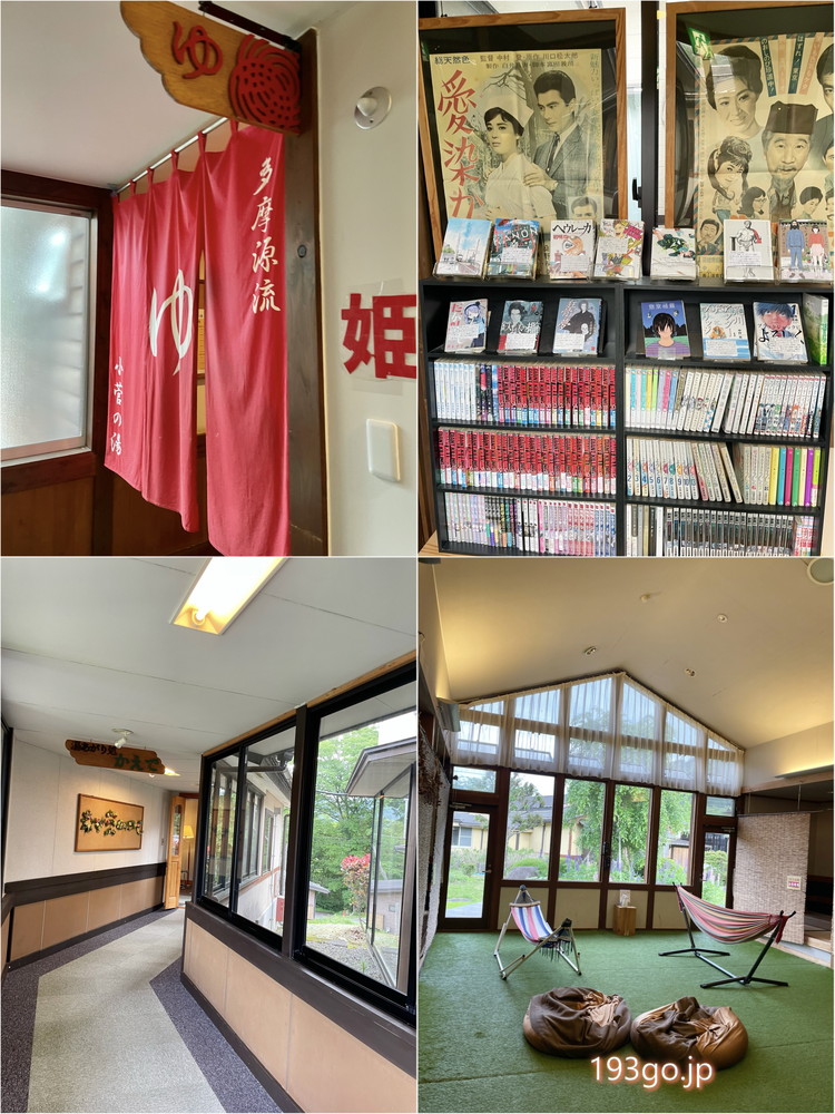 内風呂、外湯には数種類の湯舟、そして、中庭を囲むように、館内には色んな休憩スペースが。