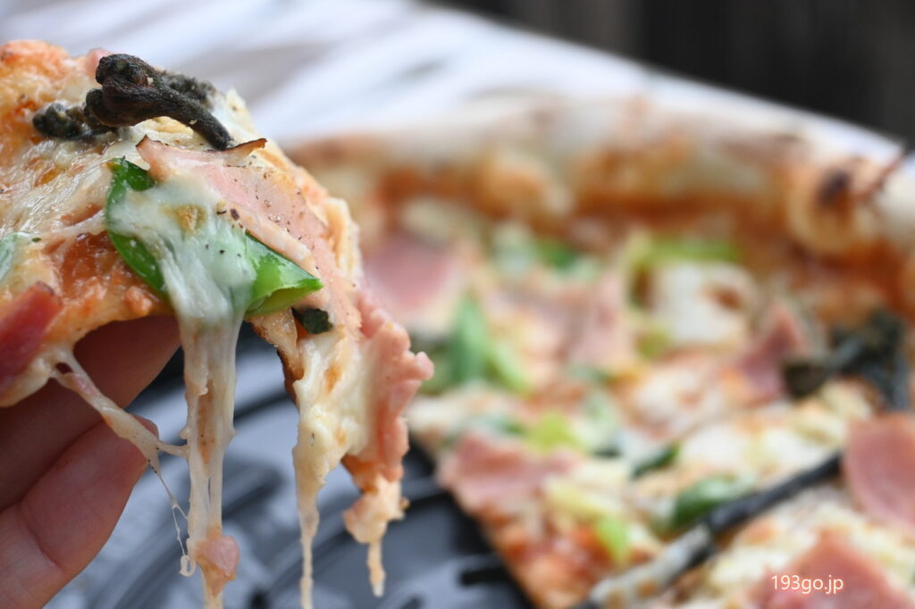 ピザは、薪の香りが香ばしいモチモチの生地。ハムや鮮やかな野菜にチーズのコクが広がる~。