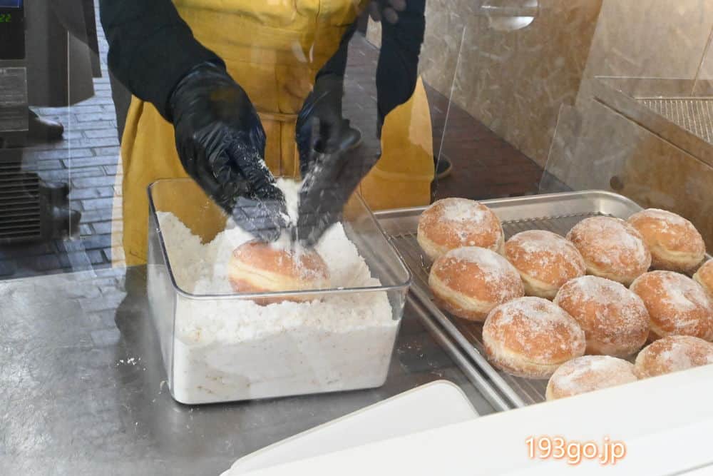 ガラス越しにはドーナツ生地をこねて丸めて、揚げて、シュガーが塗される様子が見られる。