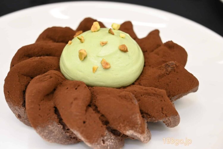 ココアパウダーをまぶしたガトーショコラドーナツに、ショコラホイップとピスタチオホイップ。ローストしたピスタチオのトッピング。