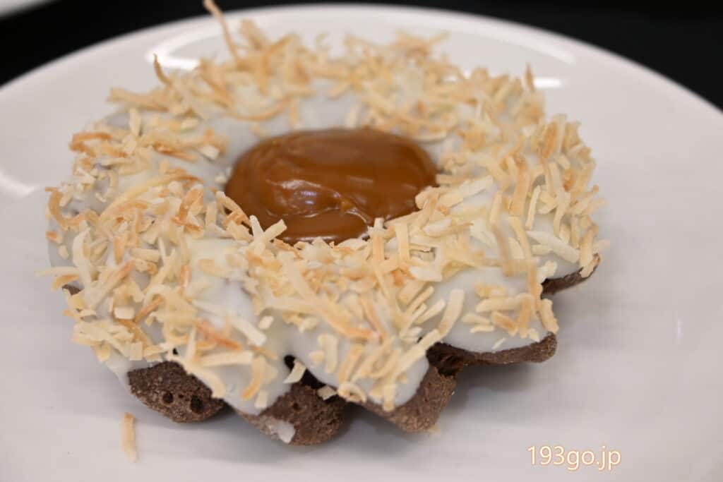 リングに満遍なくローストココナツロングがトッピングされ華やか。ココナッツのパリっとした食感がアクセントに。