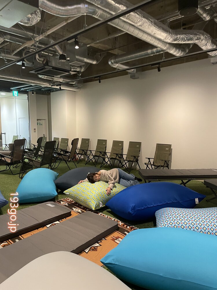 ヨギボーの特大クッションやコールマンのエア カウチ、ハンモックが置かれてる。