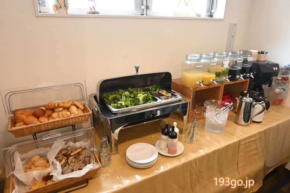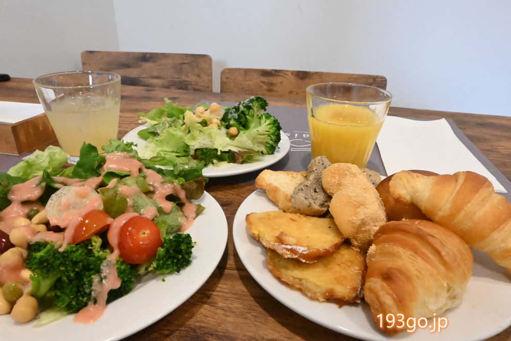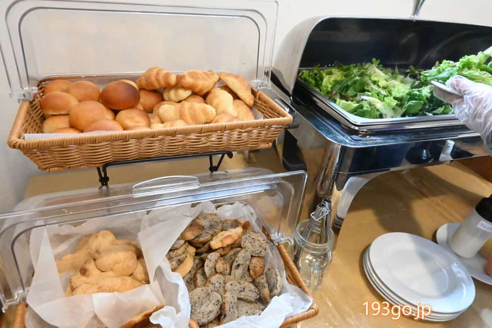 フロアの端にビュッフェ台があり、パン数種類、サラダに、ドリンクが並ぶ。これももちろんつけよう!