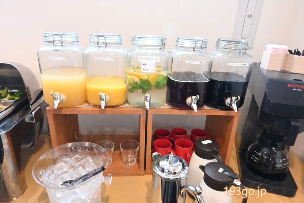 ドリンクはオレンジ、アップル、デトックスウォーター、アイスティー、アイスコーヒー、ホットコーヒー&紅茶と、この600円のセミビュッフェは満足感たっぷりだ。