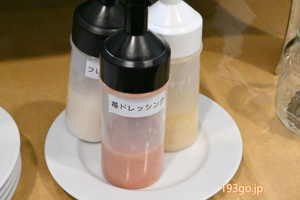 いちごドレッシングや、オニオンすりおろしと辛子を合わせてると言う自家製ドレッシングが美味しい。