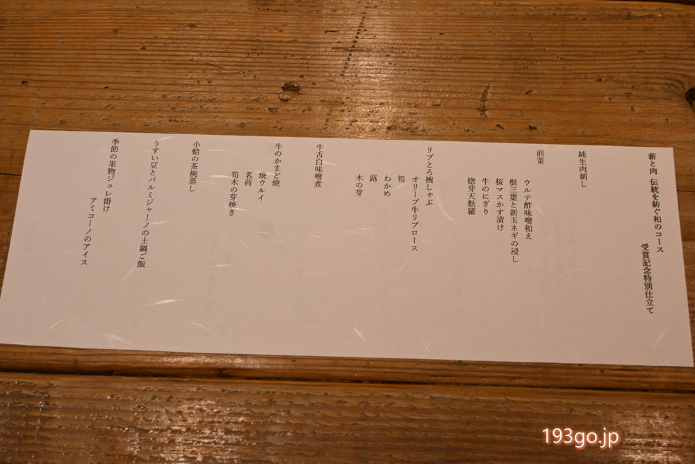 コース名:薪と肉 伝統を紡ぐ和のコース 〜受賞記念特別仕立て〜