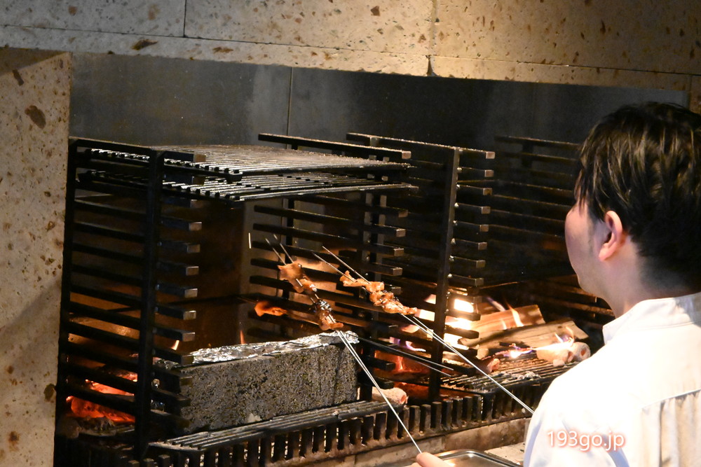 カウンター席では、オリーブ牛や美崎牛などの上質な国産ブランド肉が、薪火でじっくり焼かれていく様子を間近で眺められる。