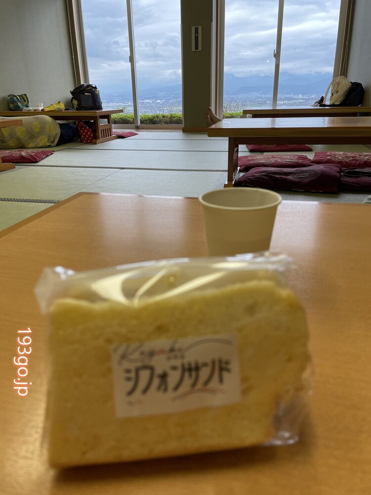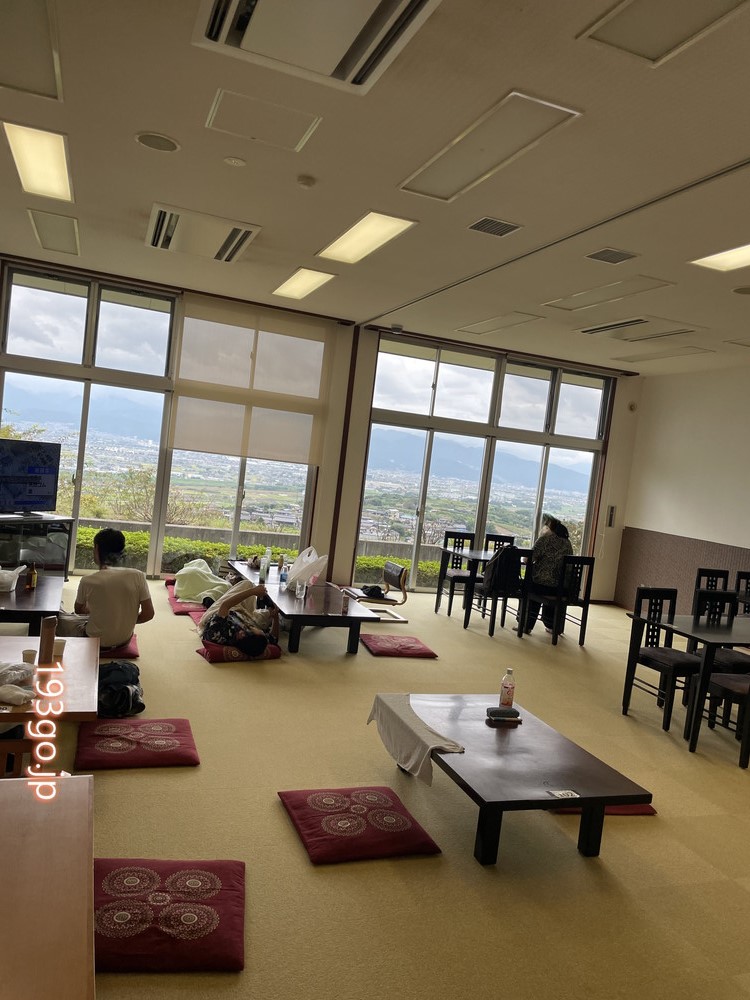 食事処、休憩所の窓からも甲府盆地を一望。休憩所は広めのスペースとこじんまりした部屋があり、人が少ない方でのんびり!