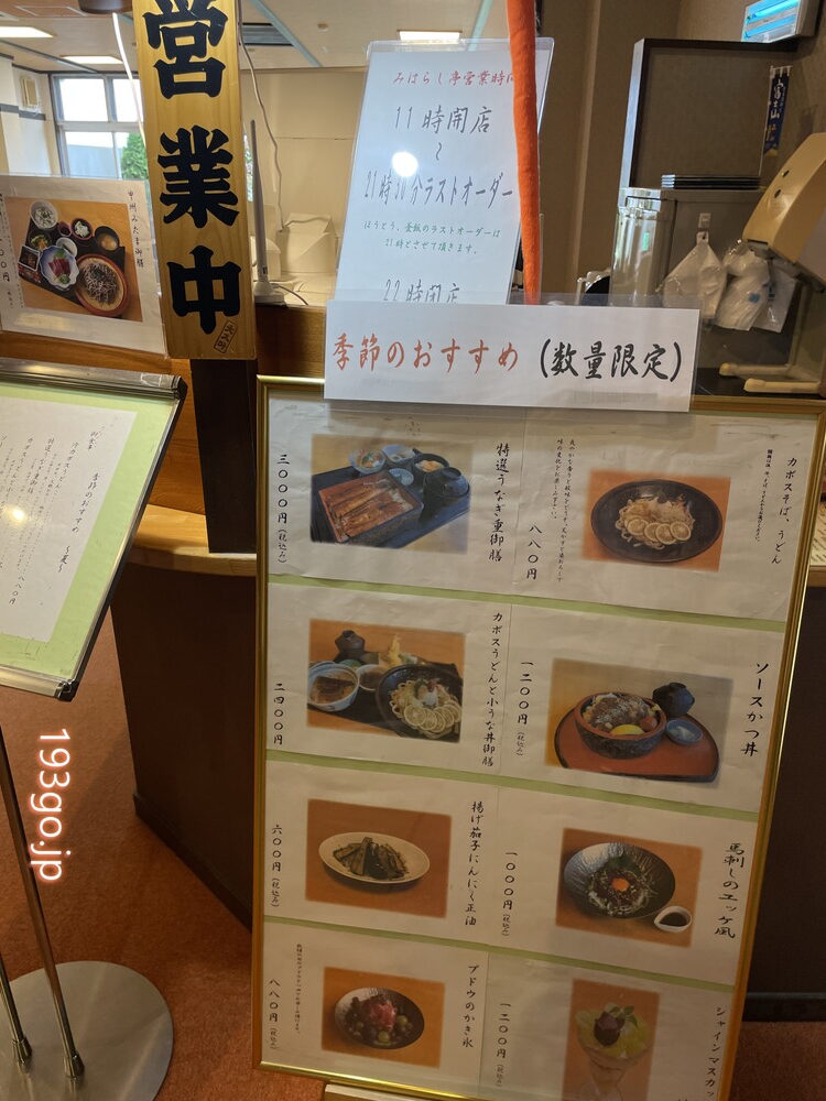 食事処 みはらし亭では、みたまの湯周辺の「のっぷい畑」で収穫された野菜を使った季節ごとのメニューを提供。ソースカツ丼やカボスうどん・そば、うな重やシャインマスカットパフェも!