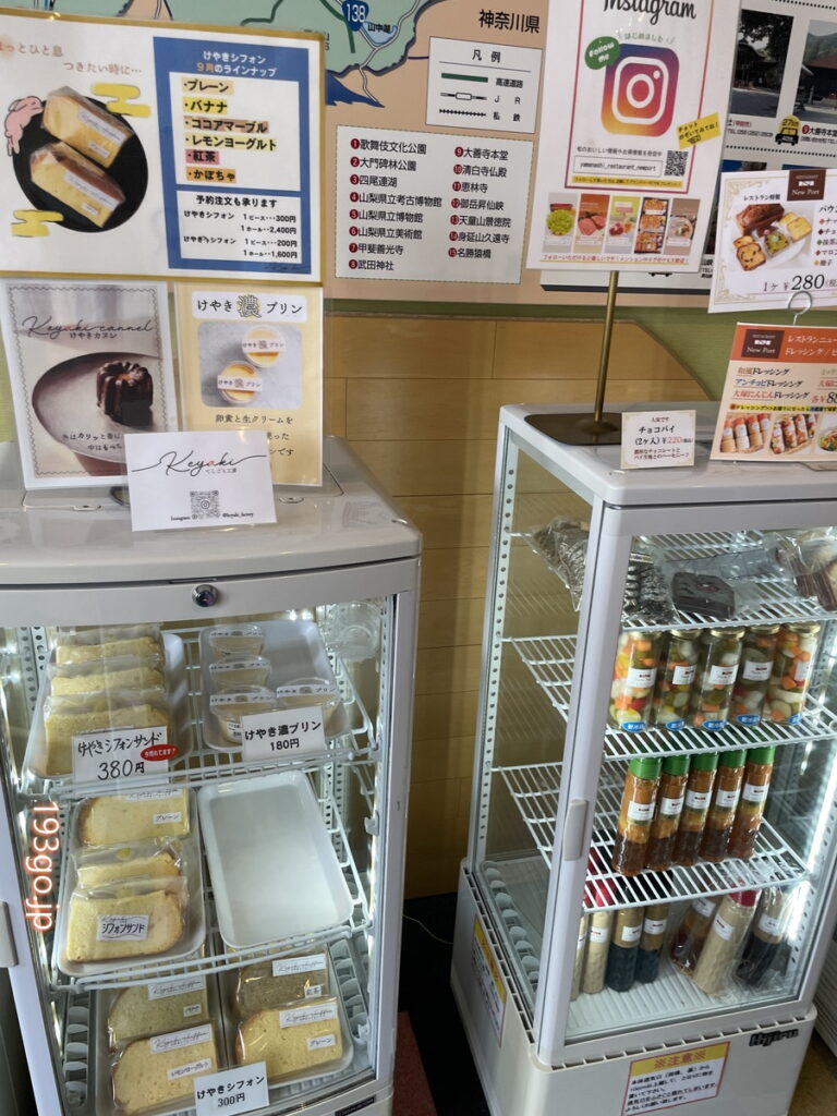 売店では、ほうとうや信玄餅、ワイン、お土産など山梨の地産品が並び、品ぞろえ豊富。