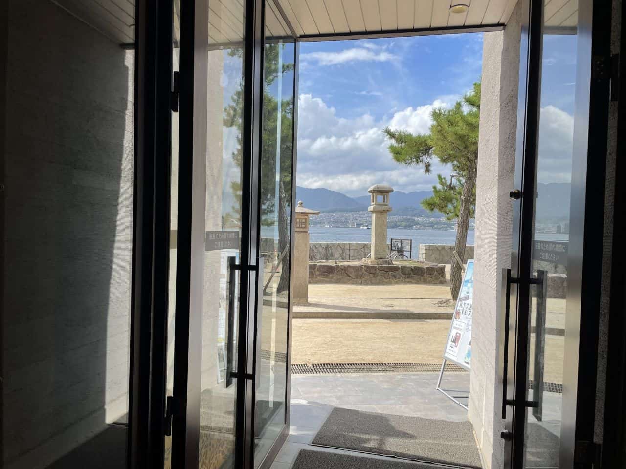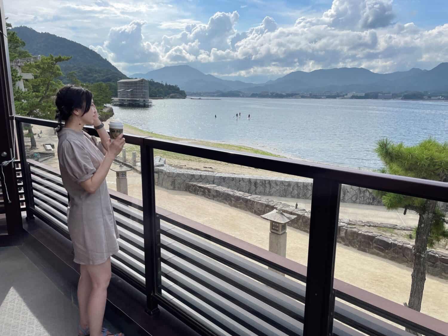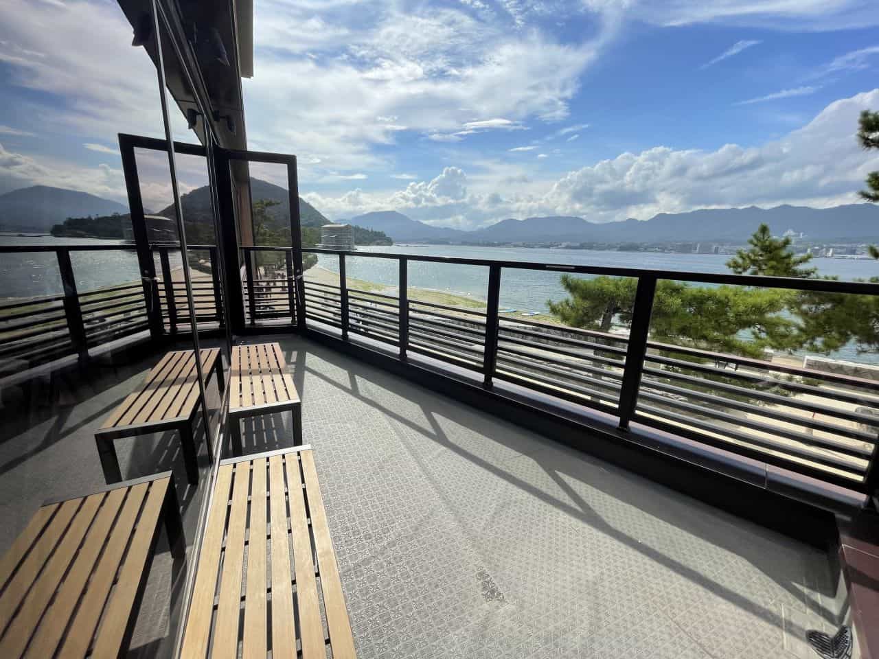 2階の海側にあるバルコニーは解放感抜群!厳島神社の大鳥居と瀬戸内海が見られるので天気が良ければ映える写真がゲットできるはず。