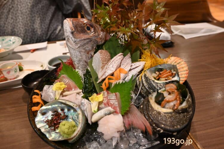 お刺身は宮島の海で採れた鯛や太刀魚、穴子に穴子の皮、サザエなど白身が多めで身はプリプリ!