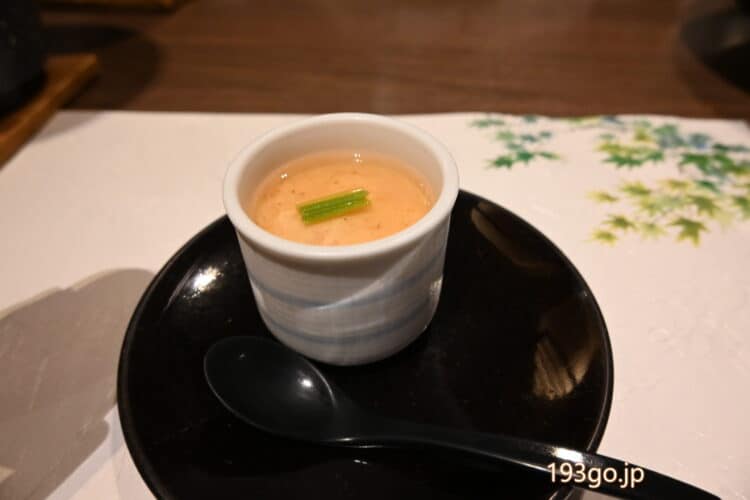 宮島産牡蠣の味噌鍋に、ヒオウギ貝黄金焼き、丸々した鱧が入ったあんかけ仕立ての冷製茶碗蒸し、タコの釜めしと海鮮づくし。