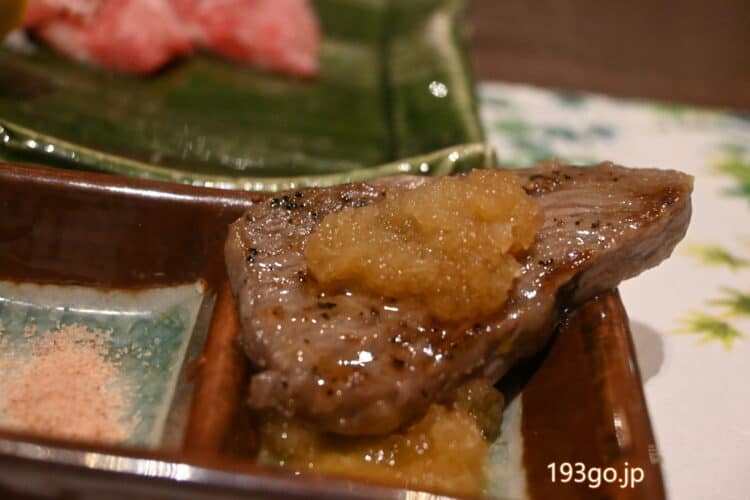 初めて食べる広島牛。コンロに陶板がセットされ、自分で焼き焼き、瀬戸内レモンを搾ってお塩や、おろしでサッパリと!柔らかい肉の旨味がジュワ~、これにお吸い物とタコ飯は至福の〆に。