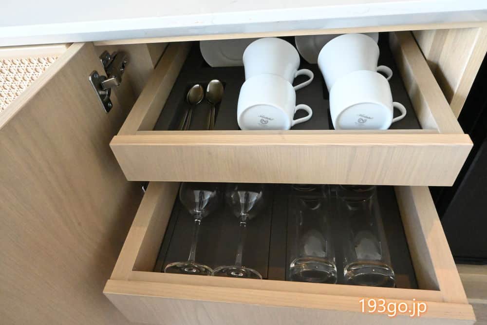 ネスプレッソのコーヒーマシン、電子ケトルとお水用のピッチャー、ティーバッグ、カップ&ソーサー、グラス。