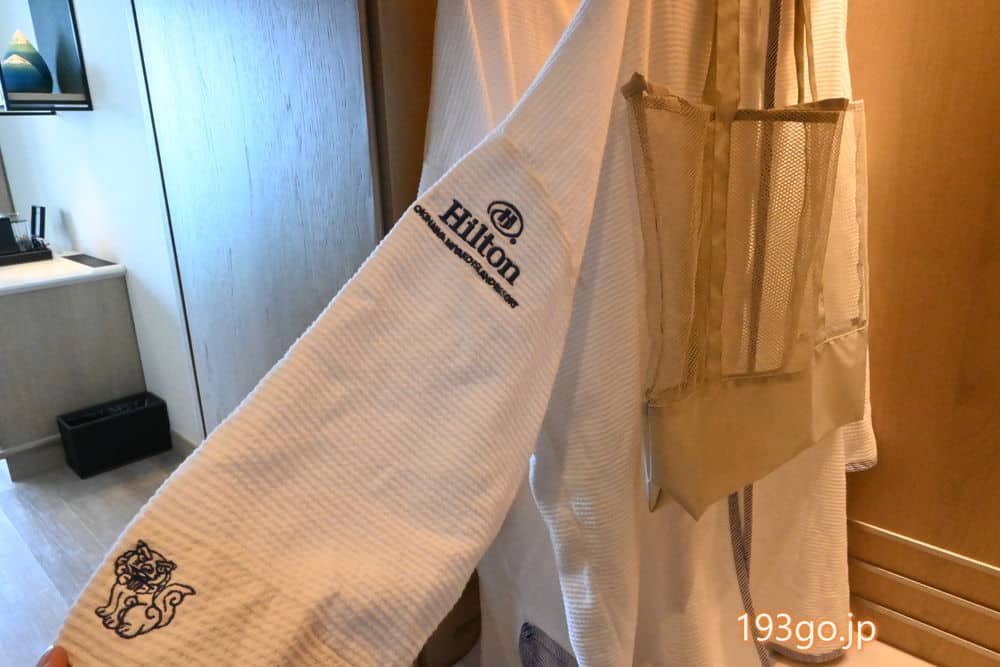 ハンガーには水着の上に羽織ってプールに行けるコットン素材のポンチョが。ヒルトンオリジナルデザインで両袖にシーサーのマーク、可愛い。