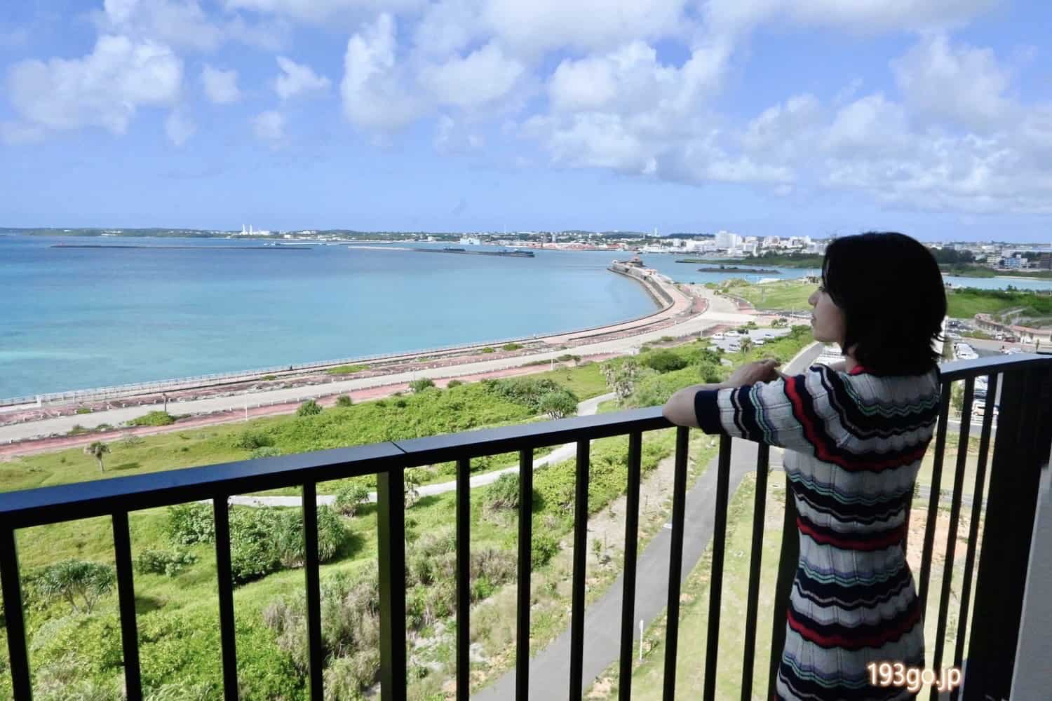 バルコニーに出ると、青い海と青い空、南国のが吹いている~。