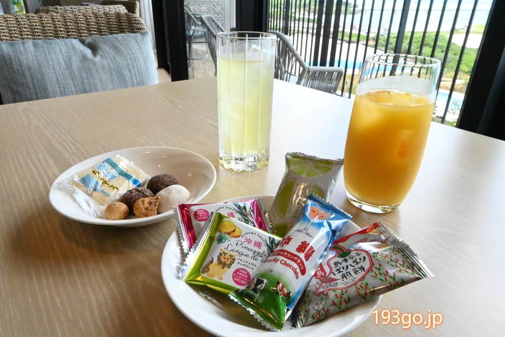 ティーサービス(~17:00)は沖縄銘菓と南国ジュース リゾート雰囲気で