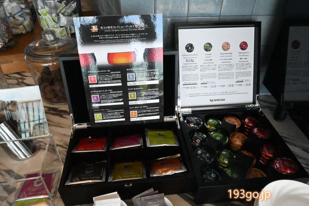 暖かい飲み物は、 ネスプレッソ コーヒー メーカーと、Dilmah(ディルマ)のティー。