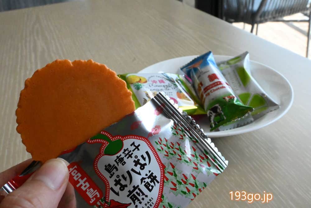 中でも「島とうがらしぱりぱり煎餅」は、その名の通りパリパリ食感でピリ辛さがクセになる。美味しかったので後でお土産に購入。