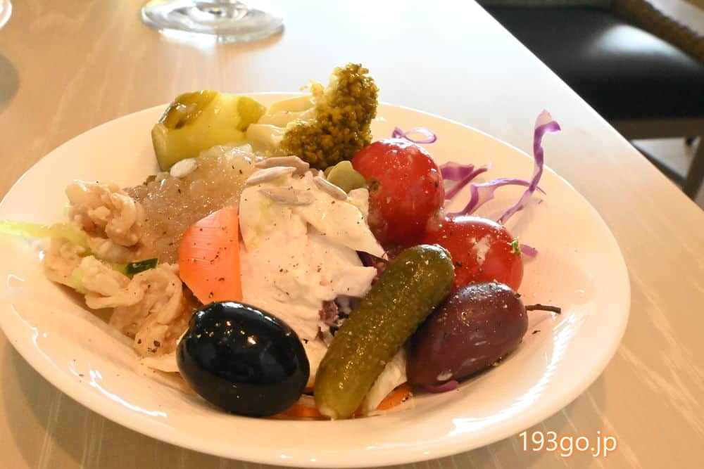 ハム、チーズ、サーモン、オリーブ、ミミガーなどのお酒に合う冷製メニューが並び、