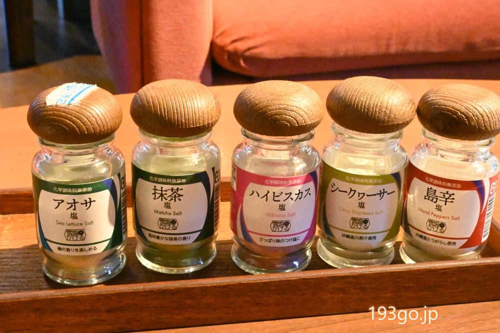 座れるところもあり、卓上には「雪塩かける」(ハイビスカス、シークヮーサー、島とうがらし、あおさなど)が用意。ソフトクリームにかけてアレンジ。