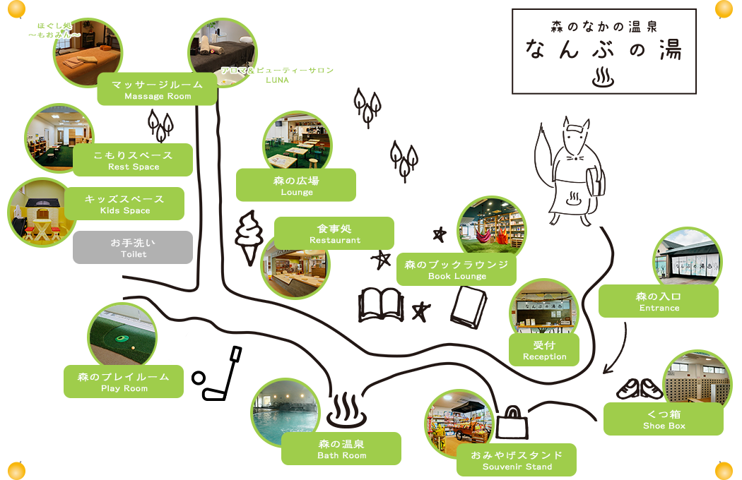「森の温泉」をコンセプトに、森の中を探検するワクワク感と森林の癒しをイメージした可愛らしい空間へ内外装が大幅リニューアル。