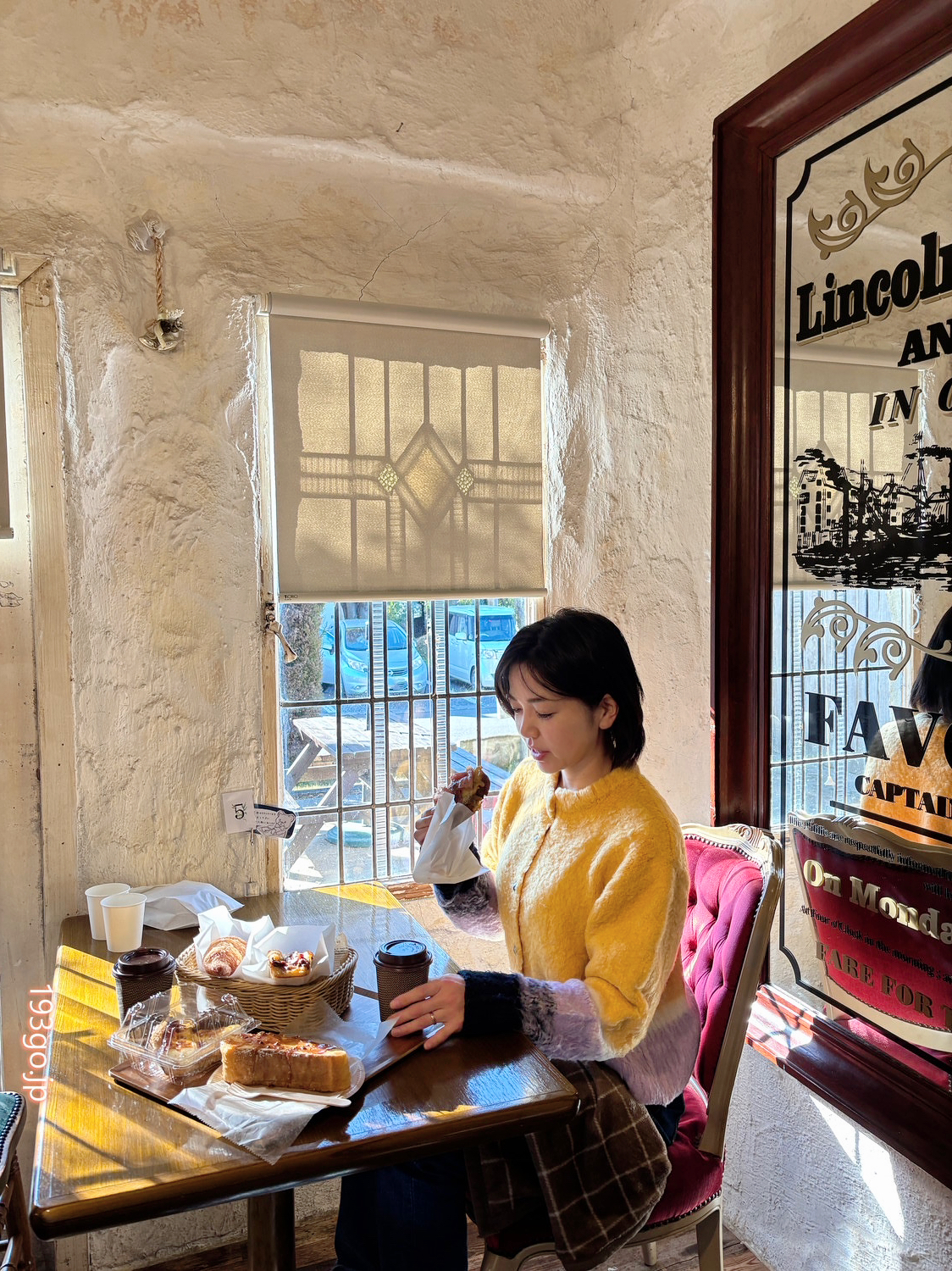 日が差し込むおしゃれな一角で赤いチェアに座って。