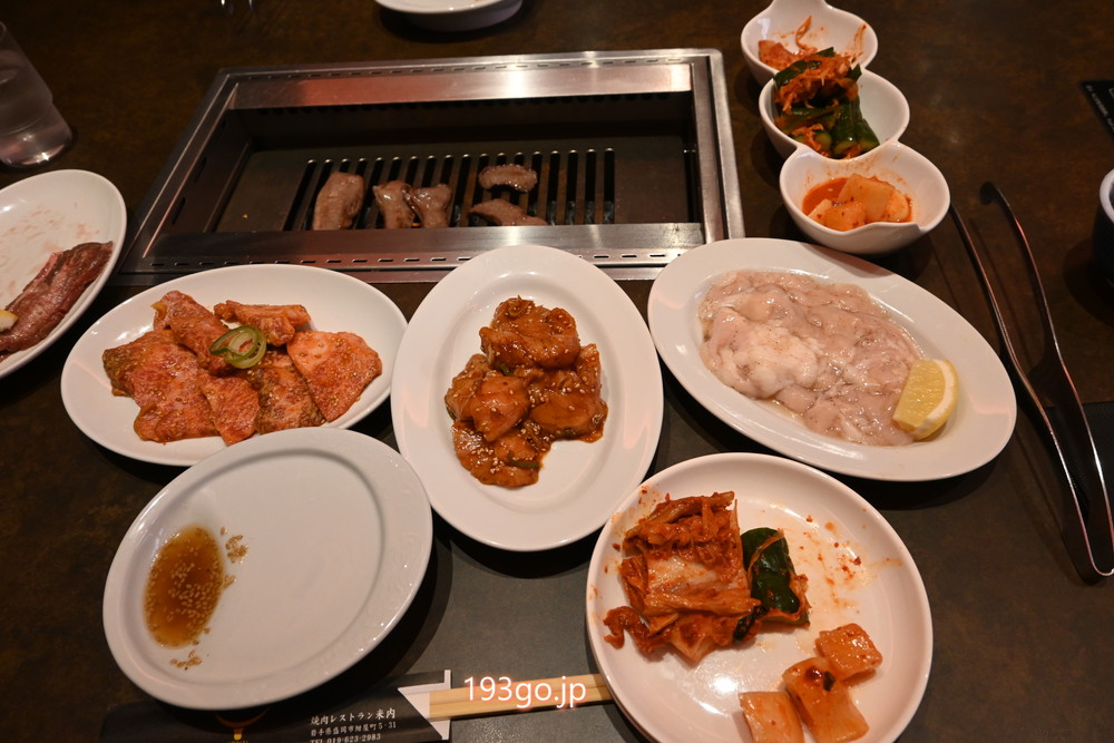 キムチ盛り合わせ、牛タン、カルビ、ハラミ、シマチョウなどを注文。