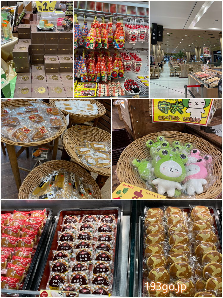 色んなパッケージの納豆、納豆スナック、茨城の名産であるメロンや栗、さつまいものスイーツやお土産が揃う。ここ守谷サービスエリアから誕生した、ゆるキャラ・守犬(もりけん)のぬいぐるみも。