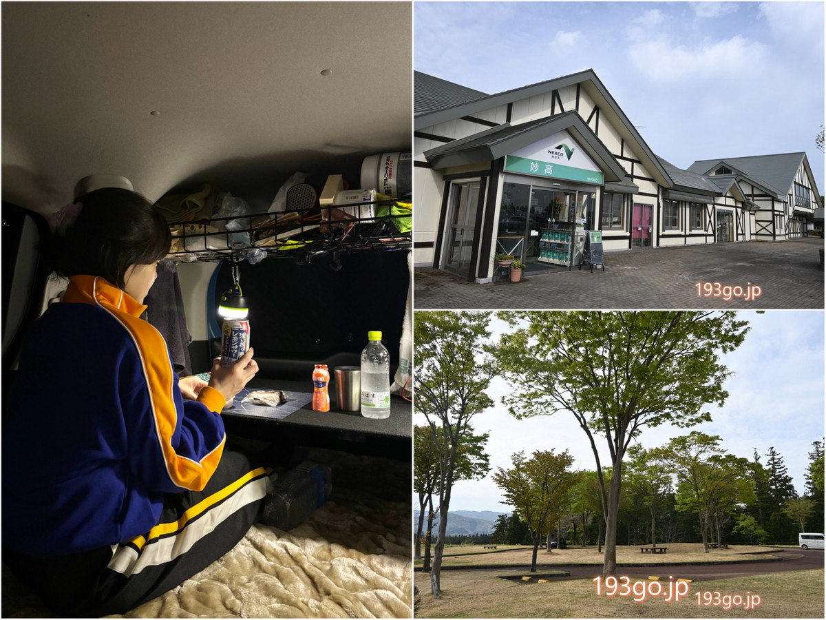 再び車を走らせ、上信越自動車道・妙高SA・下り(新潟県)に着いたのは0時半。眠気も来てだいぶ長距離を走ったので、ここに車中泊することに。交通量は少なくスイスイだった。