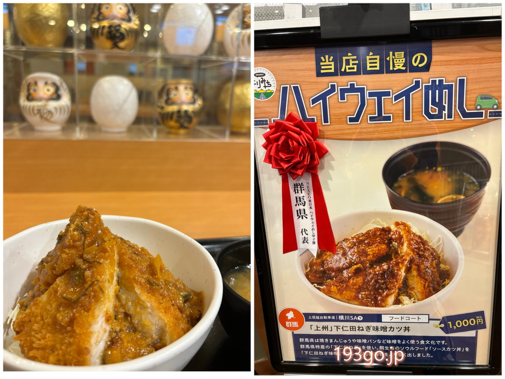 峠の釜めしやだるま弁当も名物だけど、一押しのハイウェイめし「上州 下仁田ねぎ味噌カツ丼」を。カツが分厚くて柔らかい。甘じょっぱい味噌味でご飯が進む~。