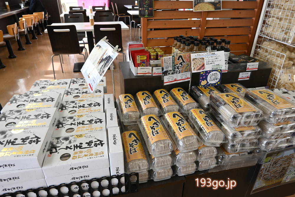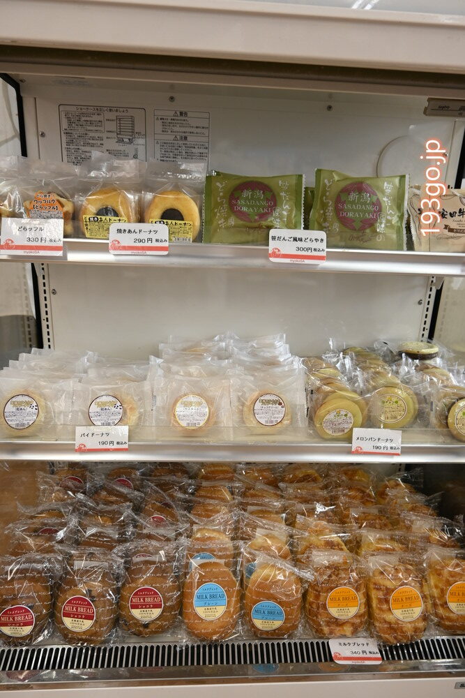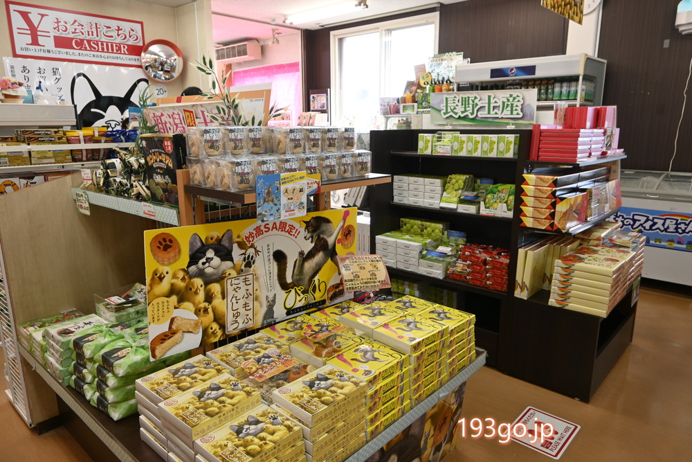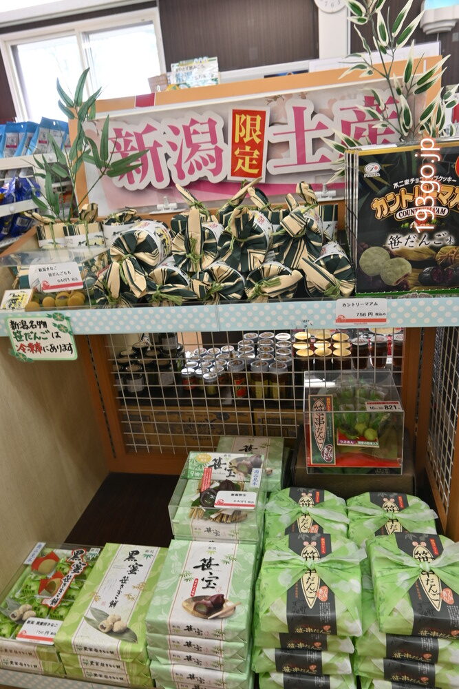 笹団子やへぎそば、柿の種などの新潟土産、妙高名物のかんずり(辛味調味料)、燕三条の金物などが販売。パン屋はなく、菓子パン・スイーツが数種類。長野県との県境のため長野土産も。