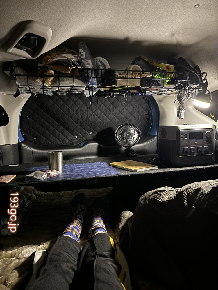使わない荷物はベッド下部の荷台に収納し、後部座席をフルフラットにして、窓全面にシェードを貼ってお休み。寝袋一つでも寒くない気候。大規模なサービスエリアのようにトラックのアイドリングなどがなく、静かで快適だった。