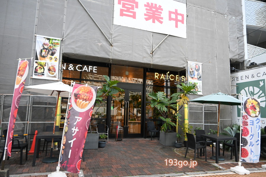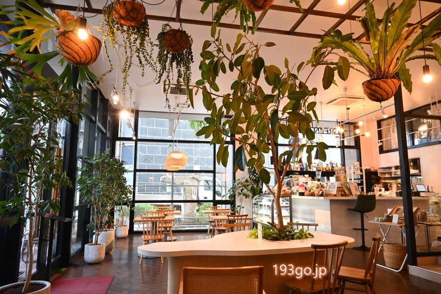 大通り沿いのお店前にテラス席、店内は白い壁に広い窓、天井が高く植物が飾られ、開放感がある。