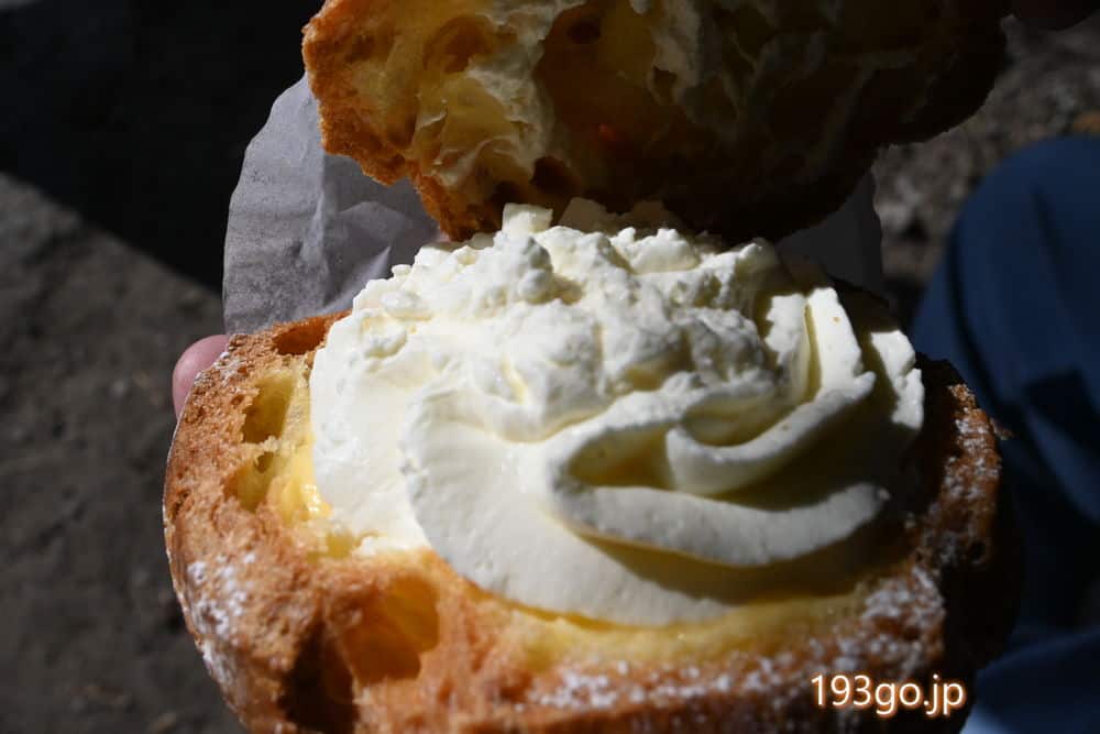 シュー生地は表面がサクサクしたしっかりタイプで、カスタードと生クリームがたっぷりとサンド。