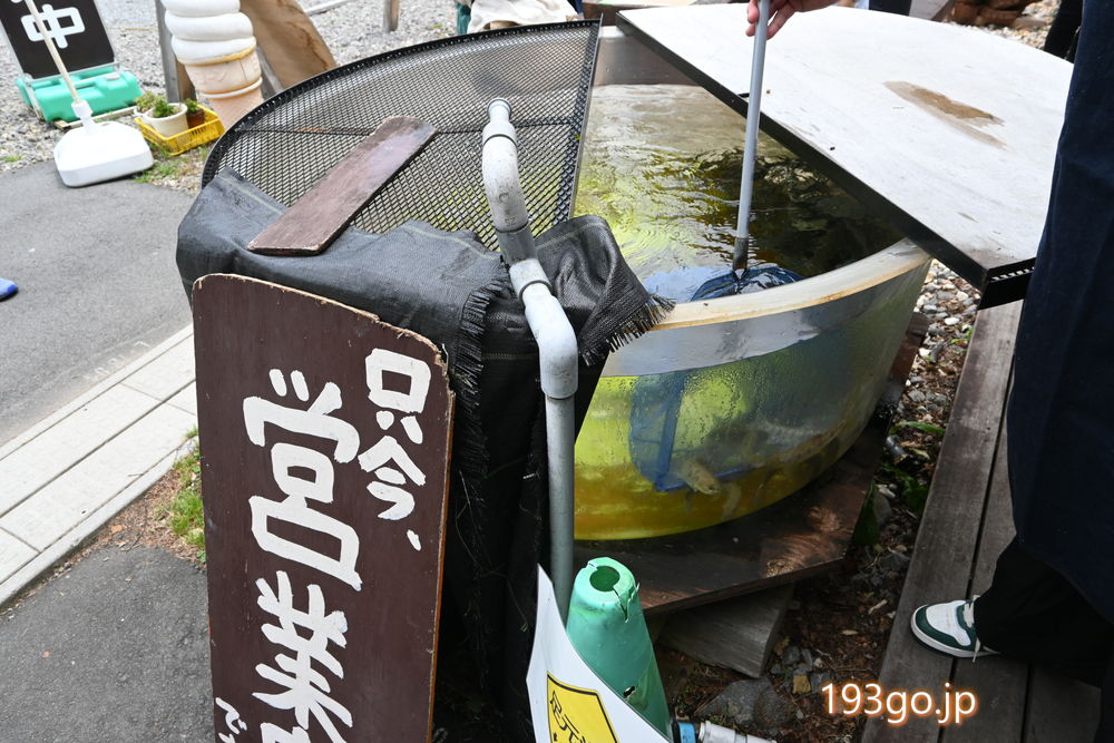 店員さんが早速向かった先は、外の水槽。泳いでるヤマメを網ですくいあげ塩焼きに!